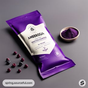 Purple resealable pouch of protein powder with small berries on a gray surface.