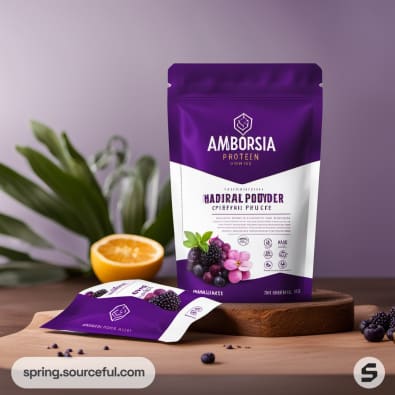Purple resealable pouch of protein with fruit and leaf props on a wooden surface.