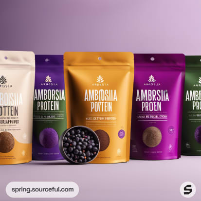Five colored resealable pouches of protein powder with different flavors on a purple background.
