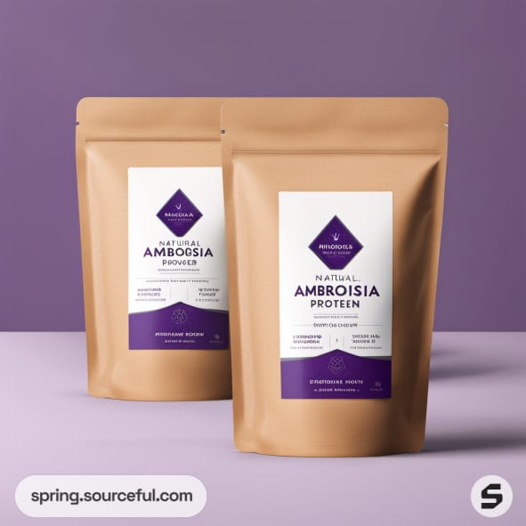 Two brown resealable pouches of protein powder with purple labels on a purple background.
