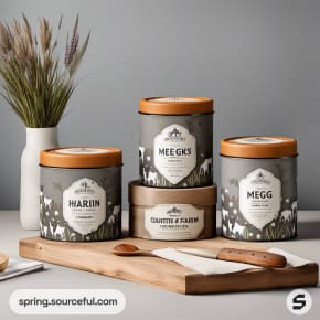 Assorted jars and bottles with farm-themed labels on a rustic background.