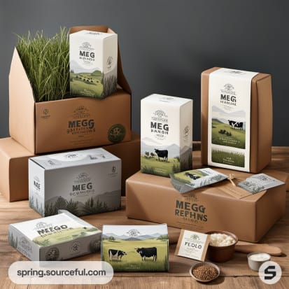 Farm-themed boxed packaging with cattle illustrations and natural tones.