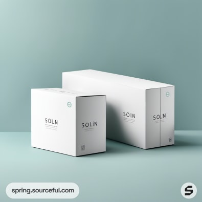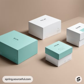 Sleek product boxes in teal and white with wave patterns on a light green surface.