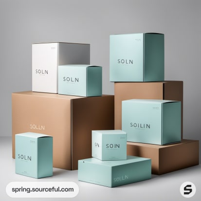 Stack of various sized product boxes in pale blue and brown against a light background.