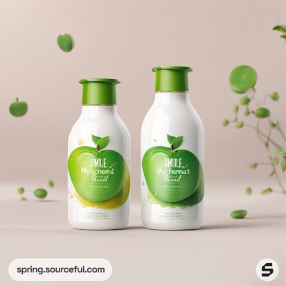 Shampoo bottles with apple design and green branding.