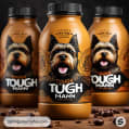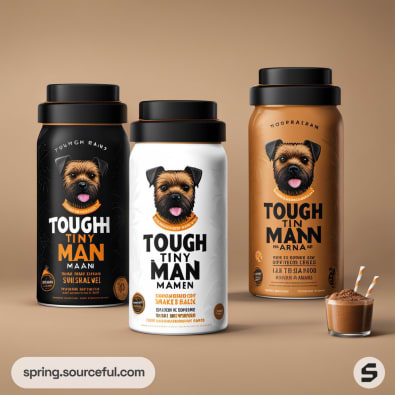 Amber bottles with cartoon dog, nutritional shake packaging.
