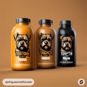 Amber and black bottles with cartoon dog, health beverage packaging.