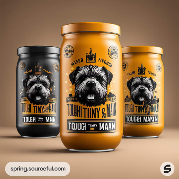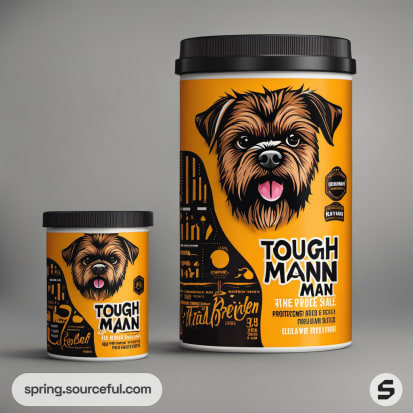 Yellow and black canister with cartoon dog, protein powder packaging.