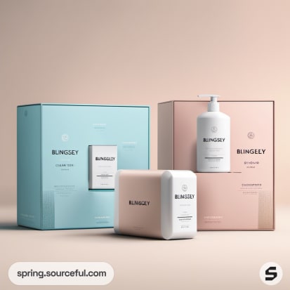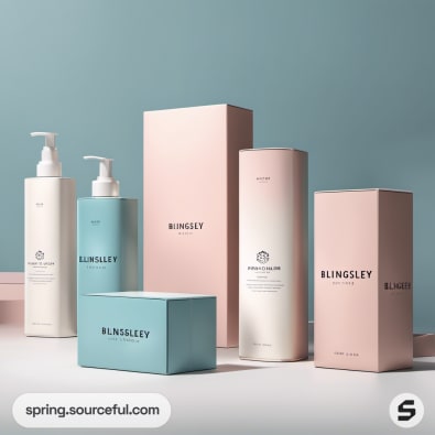 Assorted pastel boxes and bottles for Blingsley products in pink and blue.