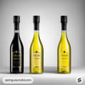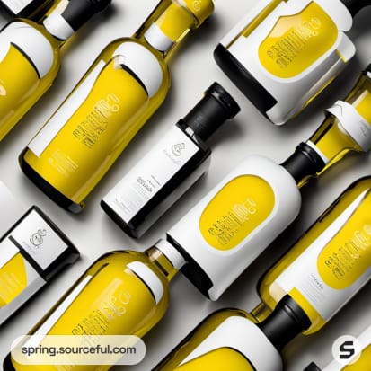 Glass bottles with yellow and white labels arranged diagonally on a white background.