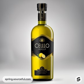 Elegant yellow bottle of Cello liqueur with lemons and leaves on a neutral background.