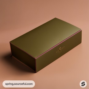 Olive green rectangular box with subtle pink accents on a brown surface.
