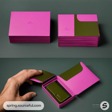Pink and green folding carton for cards on a green background.