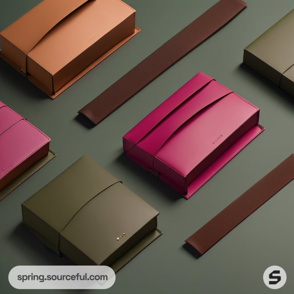 Elegant packaging in shades of pink, brown, and green with matching envelopes on a green surface.