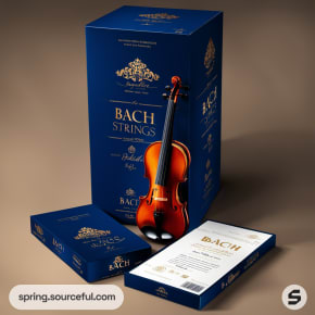 Tall navy blue packaging featuring a violin and ornate gold detailing.