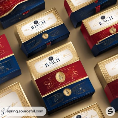 Two ornate boxes, one gold and one burgundy, featuring elegant violin-themed designs.