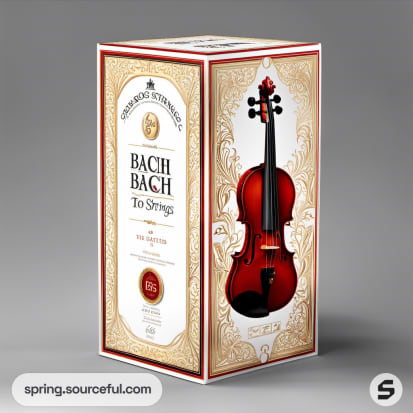 Elegant violin-themed packaging box with red and gold accents on a white background.