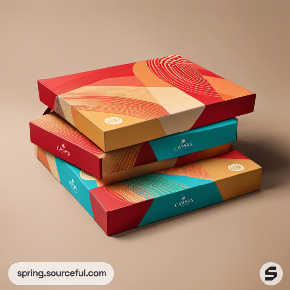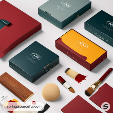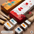 Vibrant paint-themed packaging with brushes on neutral surface.