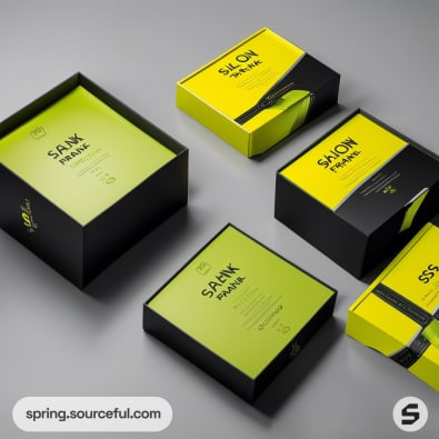 Multiple boxes with green and black design.