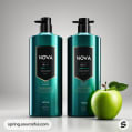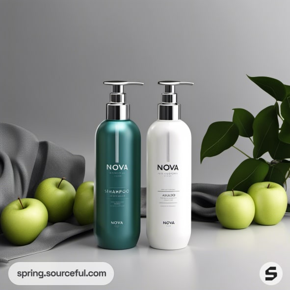 Green and white shampoo bottles with apples and foliage