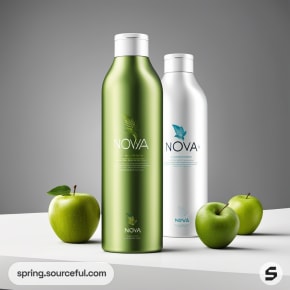 Green and silver bottles with apples on white surface