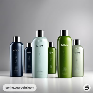 Four shampoo bottles in green and blue with scattered leaves