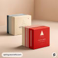 Assorted rectangular packages in beige and red with minimalist design patterns on a muted green surface.