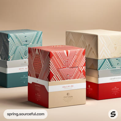 Colorful mailer boxes with geometric and abstract patterns on a light background.