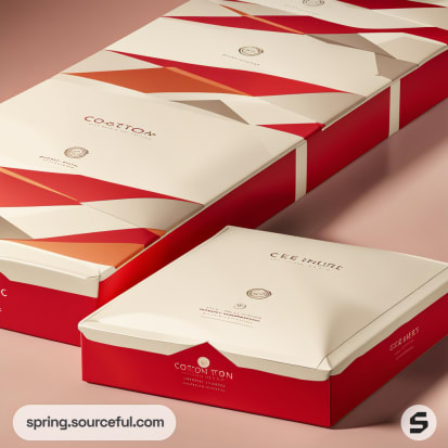 Red and cream decorative product boxes with geometric patterns standing on a surface.