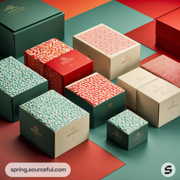Elegant cosmetic packaging with geometric patterns in teal, red, and beige tones.