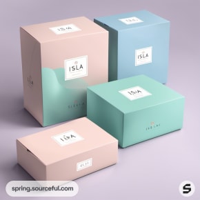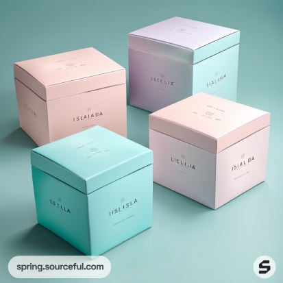 Stacked pastel boxes in pink, teal, and lilac hues.
