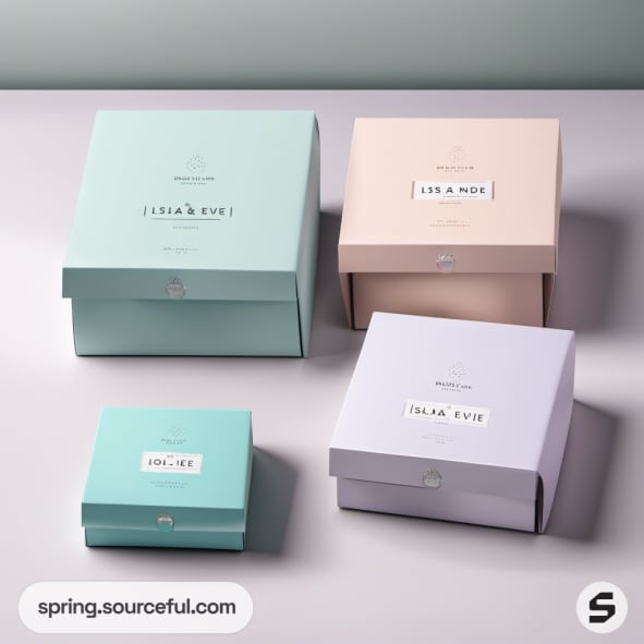 Assorted pastel gift boxes with elegant labels on a teal background.