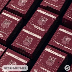 Maroon cassette boxes with owl design, vintage style.