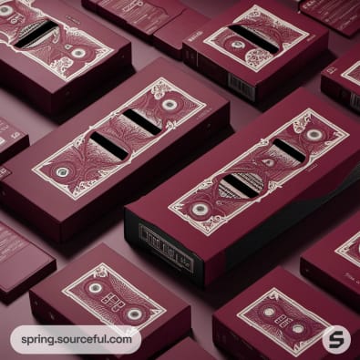 Stacked maroon cassette boxes with intricate designs.
