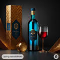 Elegant blue and gold wine bottle with matching box, next to a filled wine glass, all on dark geometric background.