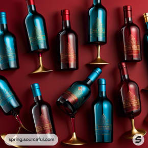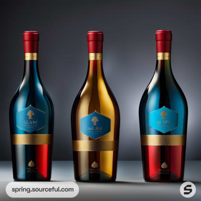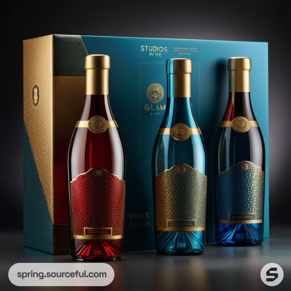Red and gold wine bottles with ornate blue labels on a blue background.