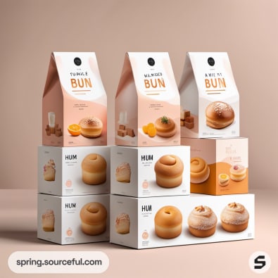 Stacked bun packaging in various designs on beige.