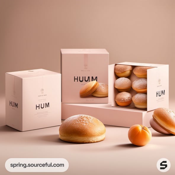 Pastel-colored boxes with buns on beige background.