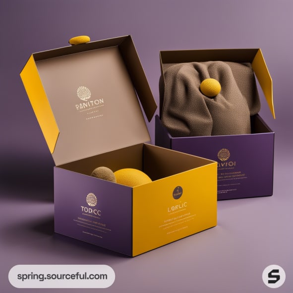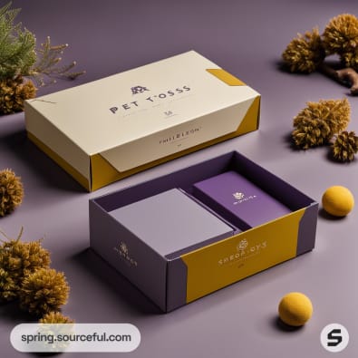 Purple and yellow mailer boxes with elegant floral design on a dark background.
