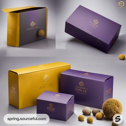 Purple and gold luxury gift boxes with elegant design on a gray background.