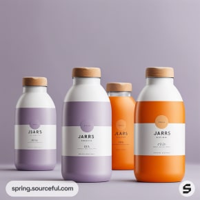Five jars with minimalistic labels in shades of peach, orange, and lavender against a beige background.