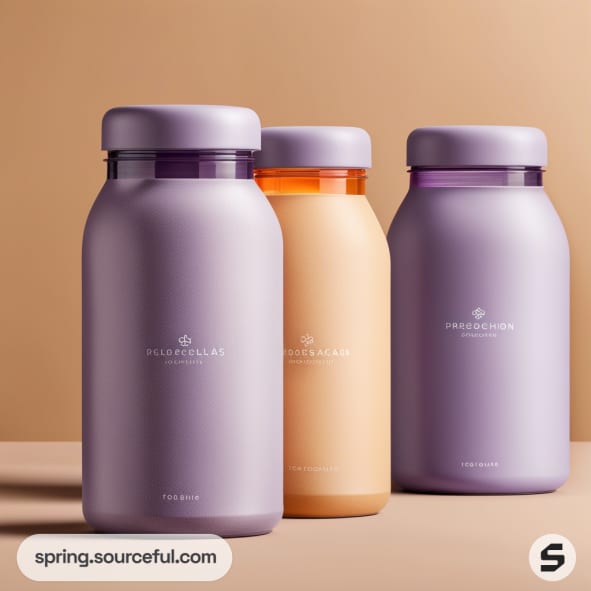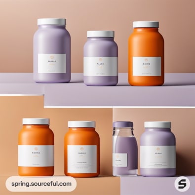Various vitamin jars in purple and orange with white labels, displayed on a pastel background.