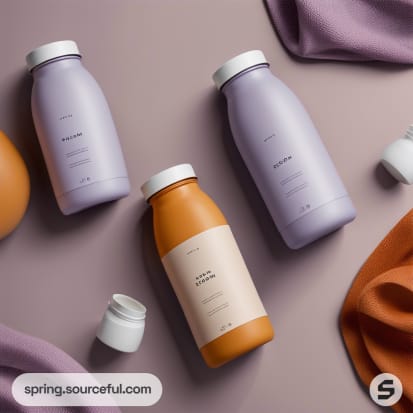 Three pastel-colored bottle containers on a peach background with fabric accents.