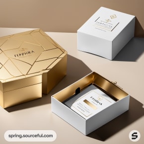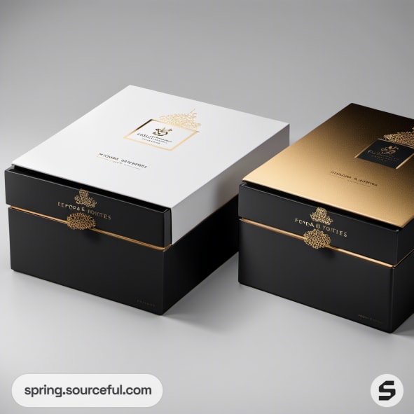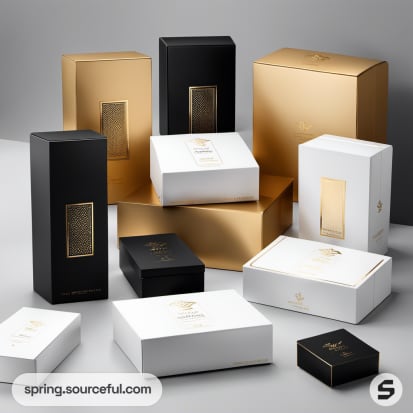 Assorted elegant black, white, and gold rectangular packaging