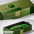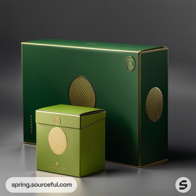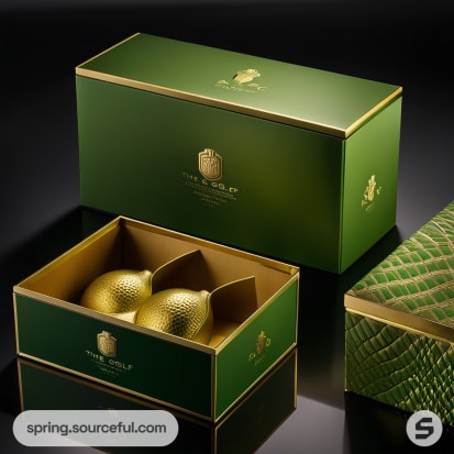 Green and gold luxury gift boxes with embossed designs, featuring two gold-textured spheres inside.