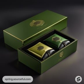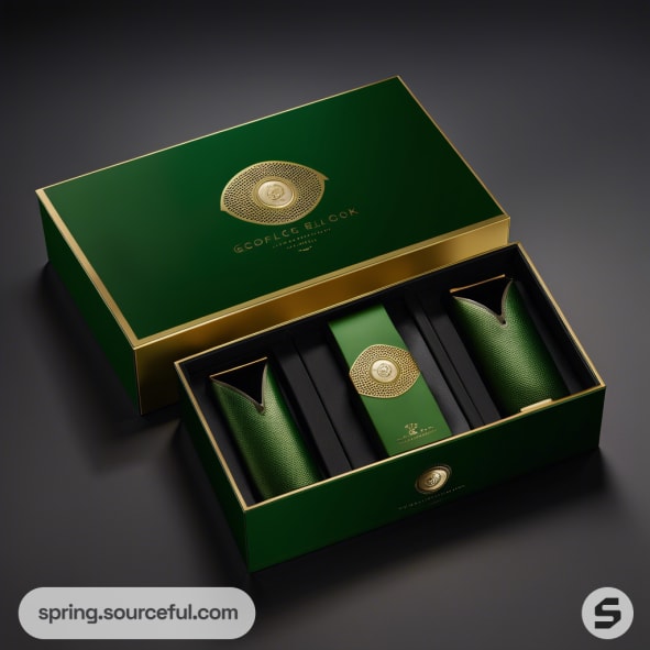 Green and gold geometric pattern luxury gift box with textured green inner packaging.