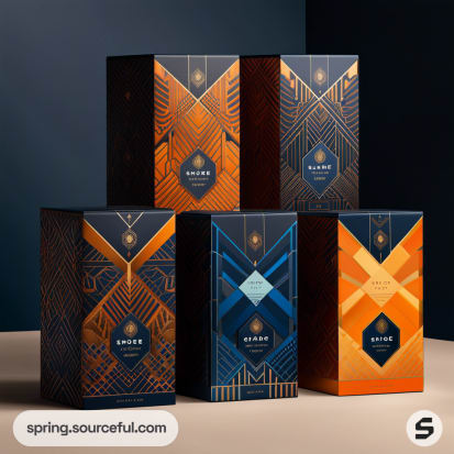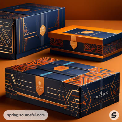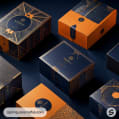 Navy and orange elegant boxes with geometric gold accents on a warm-toned background.