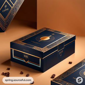 Navy and gold coffee box with elegant pattern, surrounded by coffee beans on a warm-toned surface.