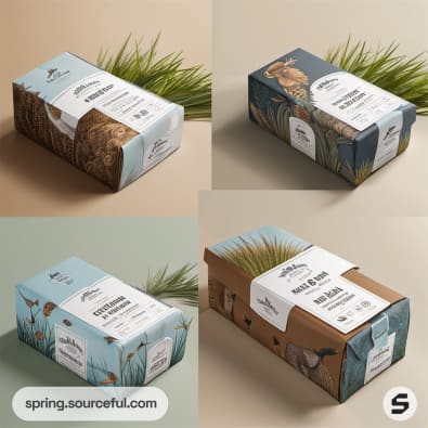 Four boxes with natural designs and animal images.