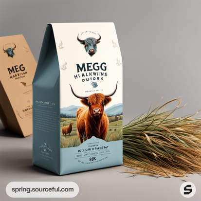 Blue and brown stand-up pouch with cow illustration.